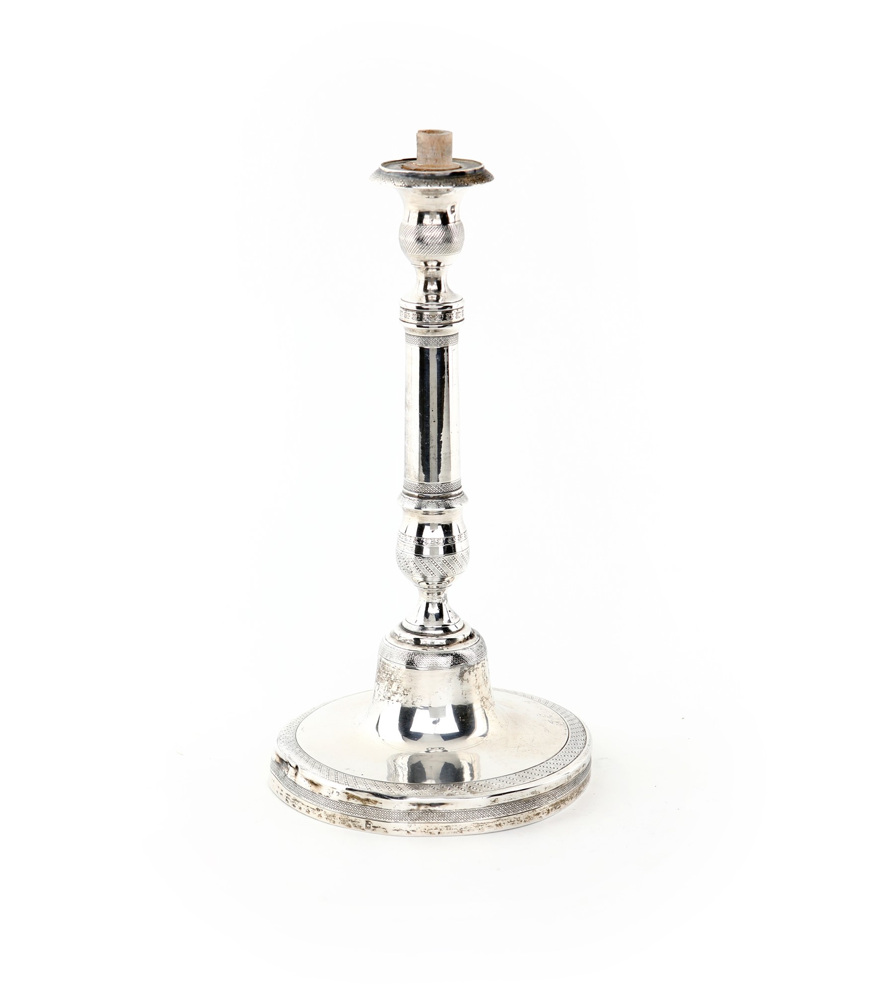 Antico candeliere in argento, Napoli fusto a colonna su piede circolare; decorazione minima al bulino. Difetti, altezza cm 25 - gr. 270