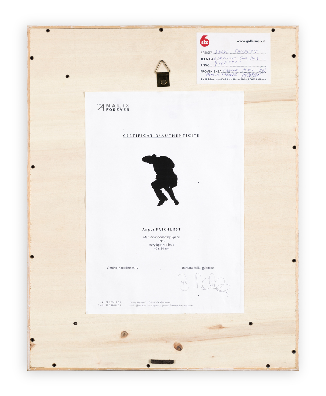 Certificato di autenticità a cura della Galleria Analix Forever (GINEVRA) recante timbro della Galleria Six (MI) al retro