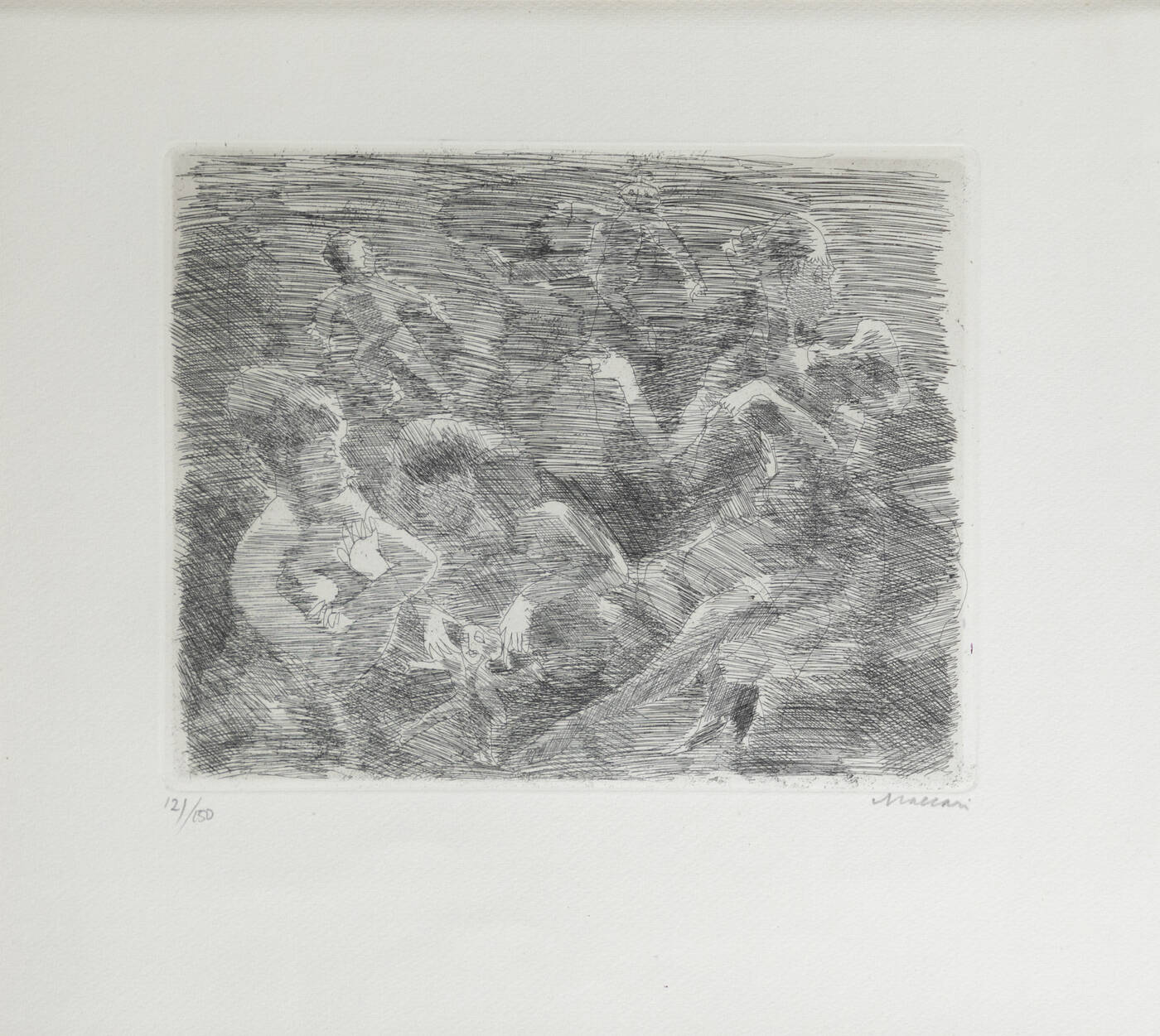 Opera firmata in basso a destra e numerata in basso a sinistra (a matita sul foglio); iscritta al retro: Mino Maccari "I pulcini" 1957 / acquaforte