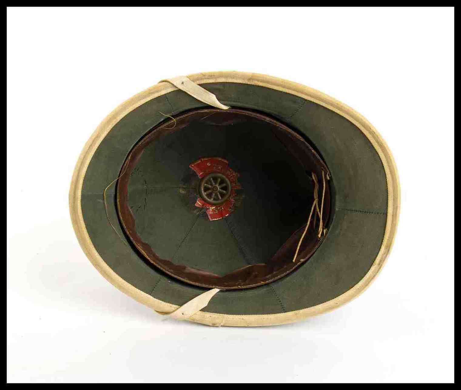 sughero rivestito di tela bianca, fregio di canottiglia argento su coccarda tricolore, fodera verde, casco di acquisto privato, ottimo stato