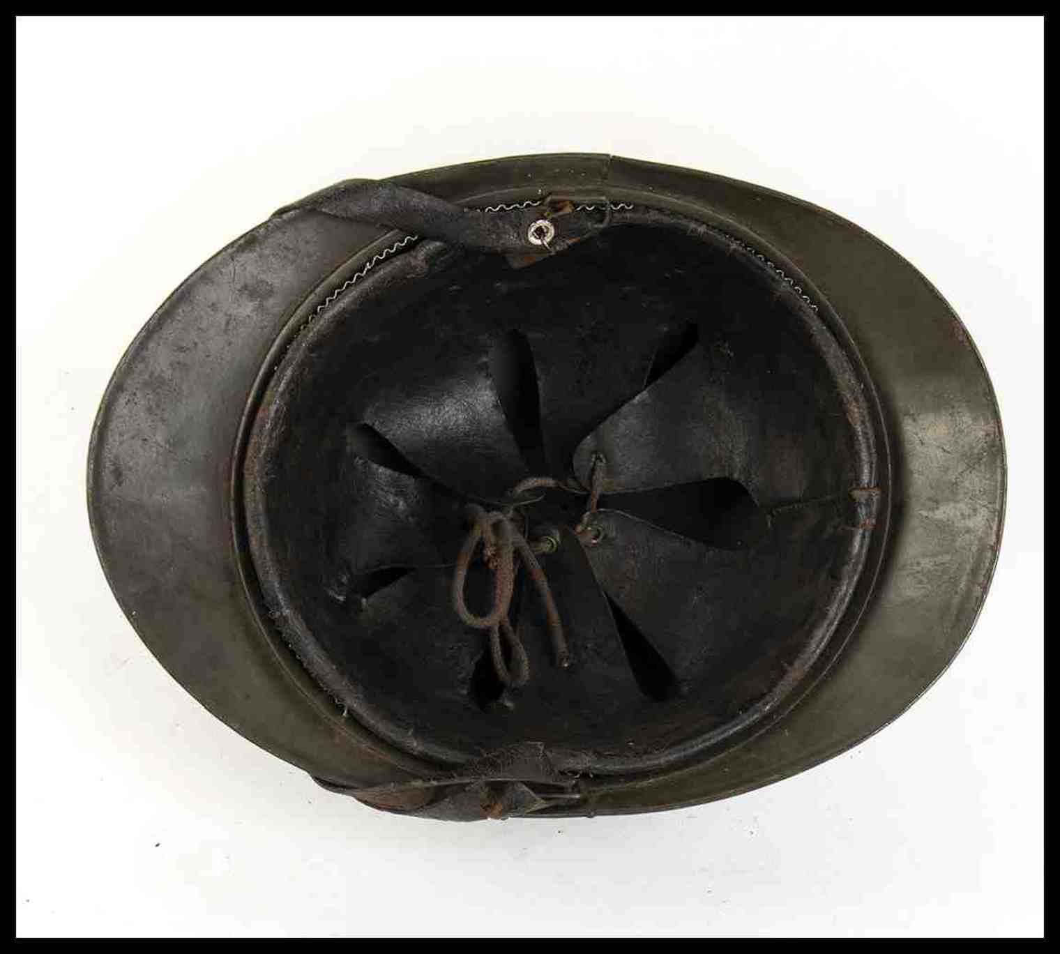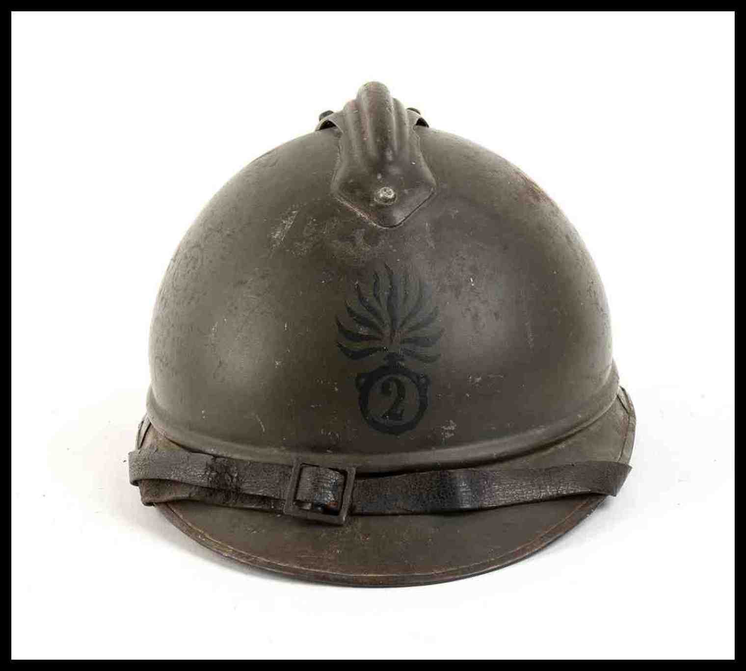elmetto di fabbricazione francese verniciato grigio verde con bel fregio del 2° Reggimento Granatieri dipinto a mano, interno in pelle nera, in patina, molto bello, ottimo stato