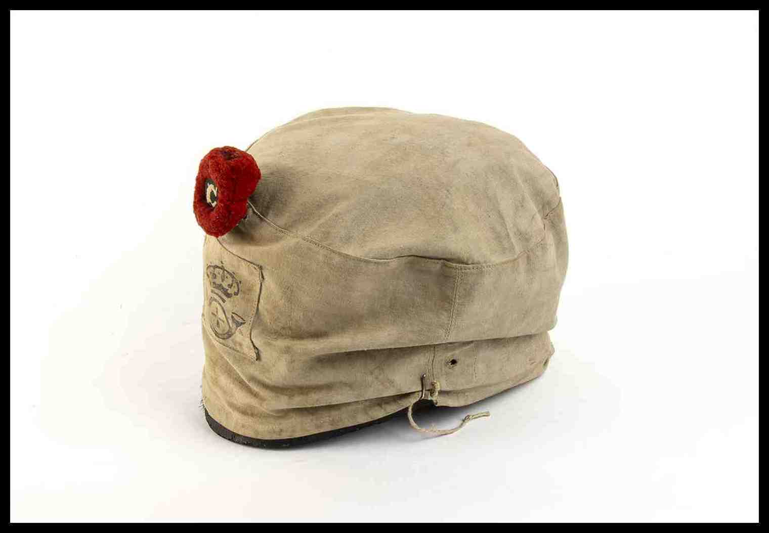 fusto in feltro ricoperto di pelo con applicato fregio metallico del 16° Rgt Cavalleggeri di Lucca su coccarda, nappina in lana rossa della Compagnia Comando, bel telino in tela di cotone grigia con fregio dei cavalleggeri fuori corpo, buono stato
