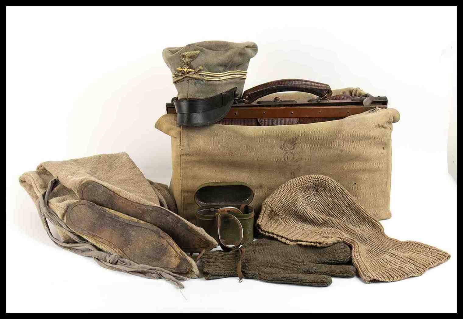 composto da berretto da tenente con gradi e fregio a bassa visibilità, valigia con stampigliato fregio di artiglieria campale in cui troviamo un passamontagna, calzari ed occhiali da pilota, bellissimo insieme, ottimo stato