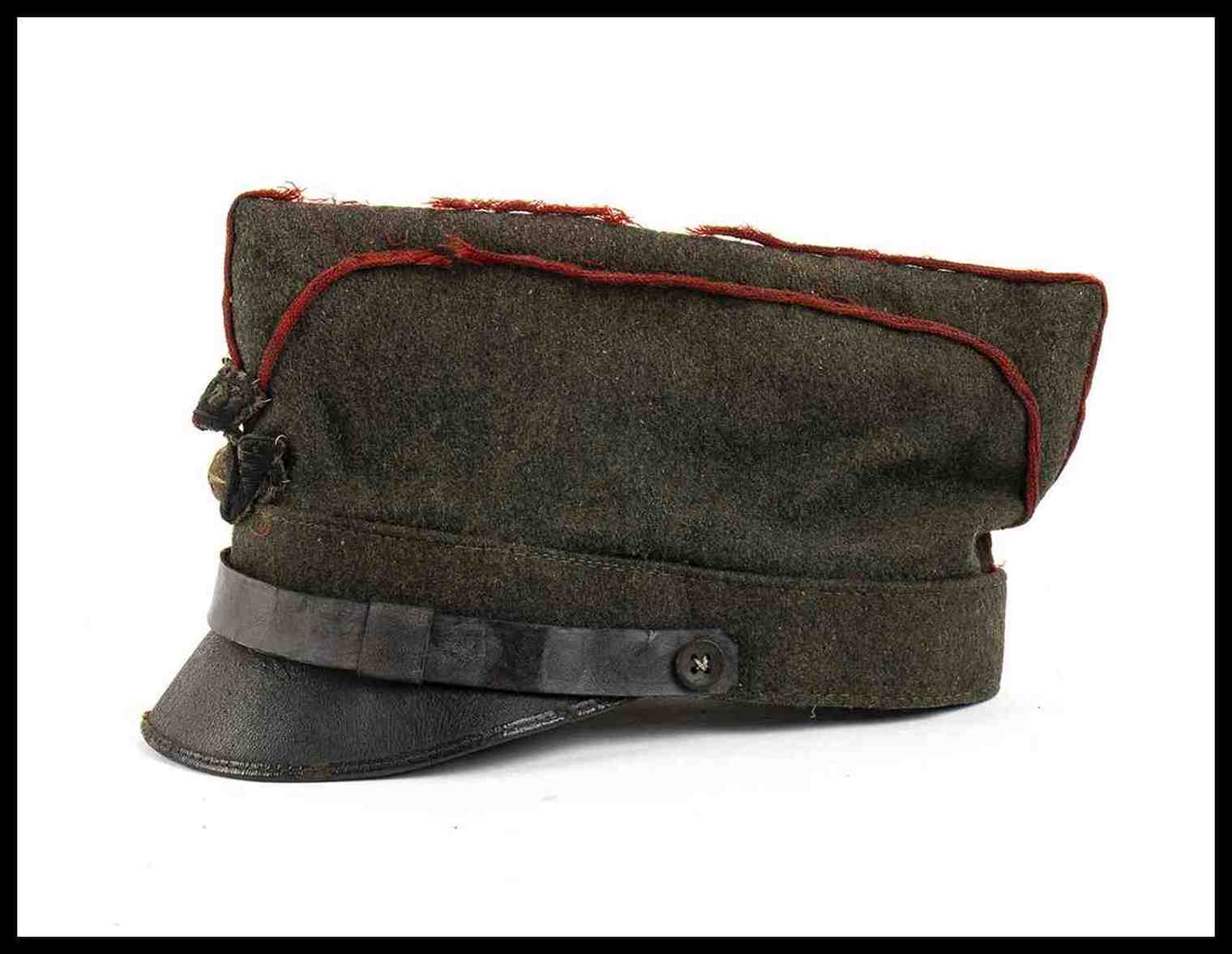 in lana grigio verde, filettature rosse, bel fregio di lana nero con croce al tondo, visiera di cuoio bordata, marchi all’interno, buono stato