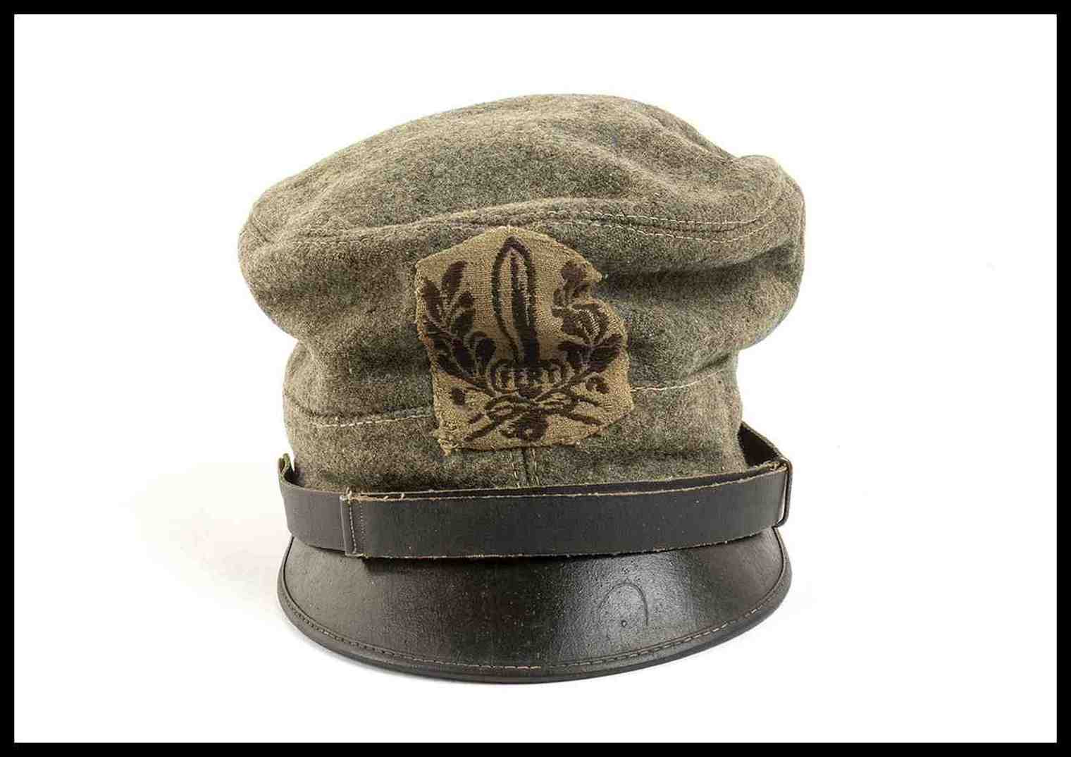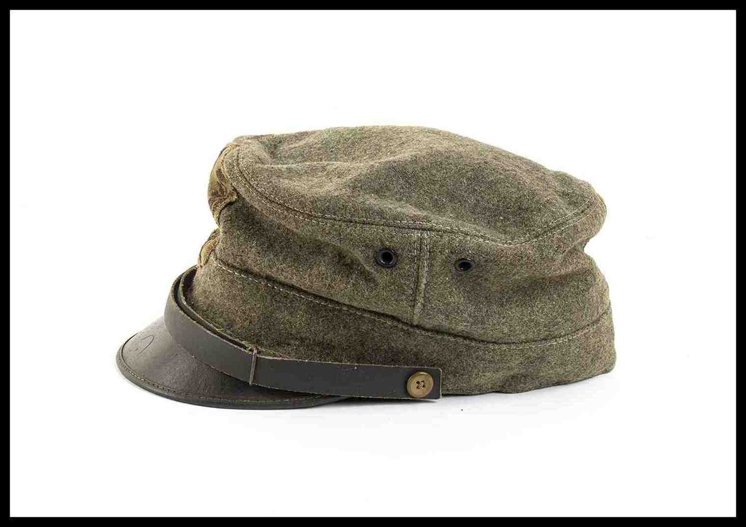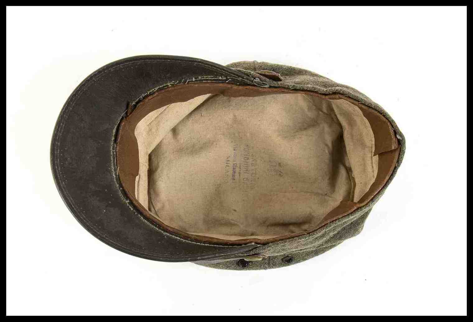 in lana grigio verde, con doppio occhiello da areazione di ferro smaltato nero, fregio in tessuto, soggolo di pelle scorrevole, interno in cottone naturale, con alluda di pelle marrone, interno marcato con taglia e timbro della sartoria FUNGHINI di Milano, ottimo stato, molto raro