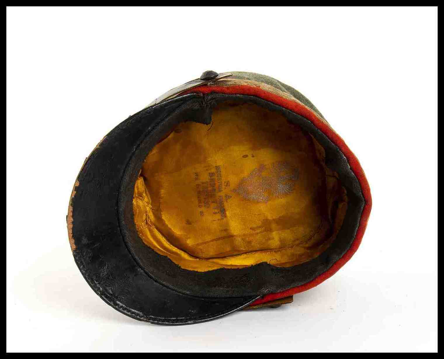 in panno di lana con greca in ricamo di cotone su panno rosso, aquila in filo, visiera di cuoio nero bordata, interno di cotone, ottimo stato