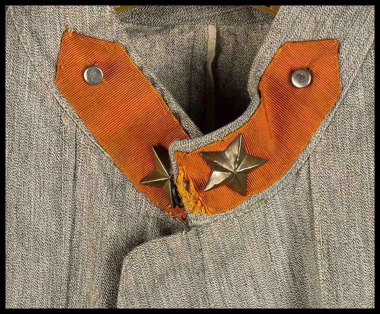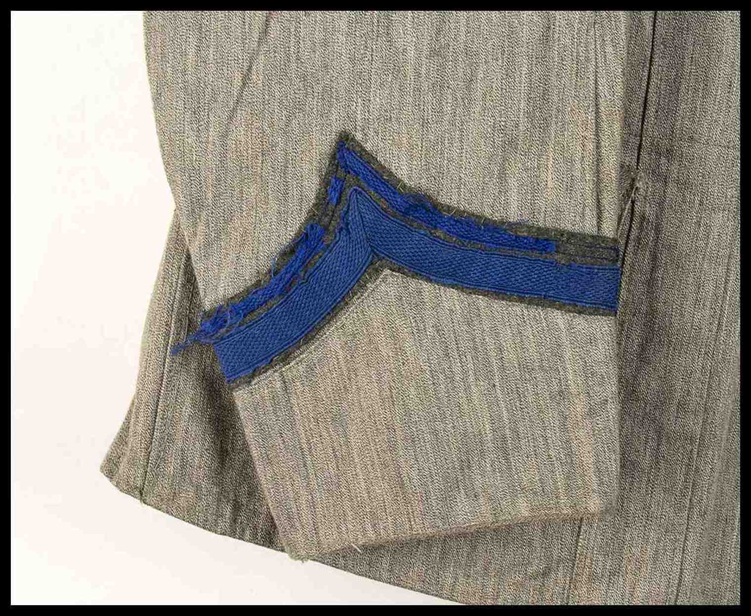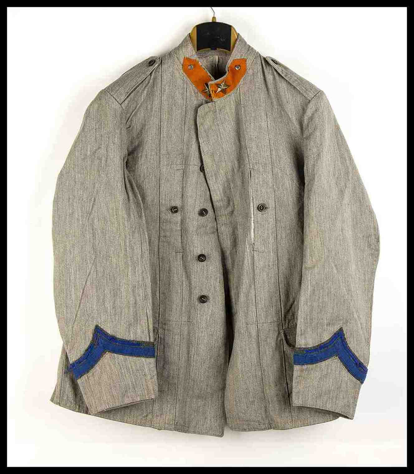 in tela bigia, con gradi alle maniche in tessuto azzurro, mostrine al collo, con pantaloni, in ottimo stato