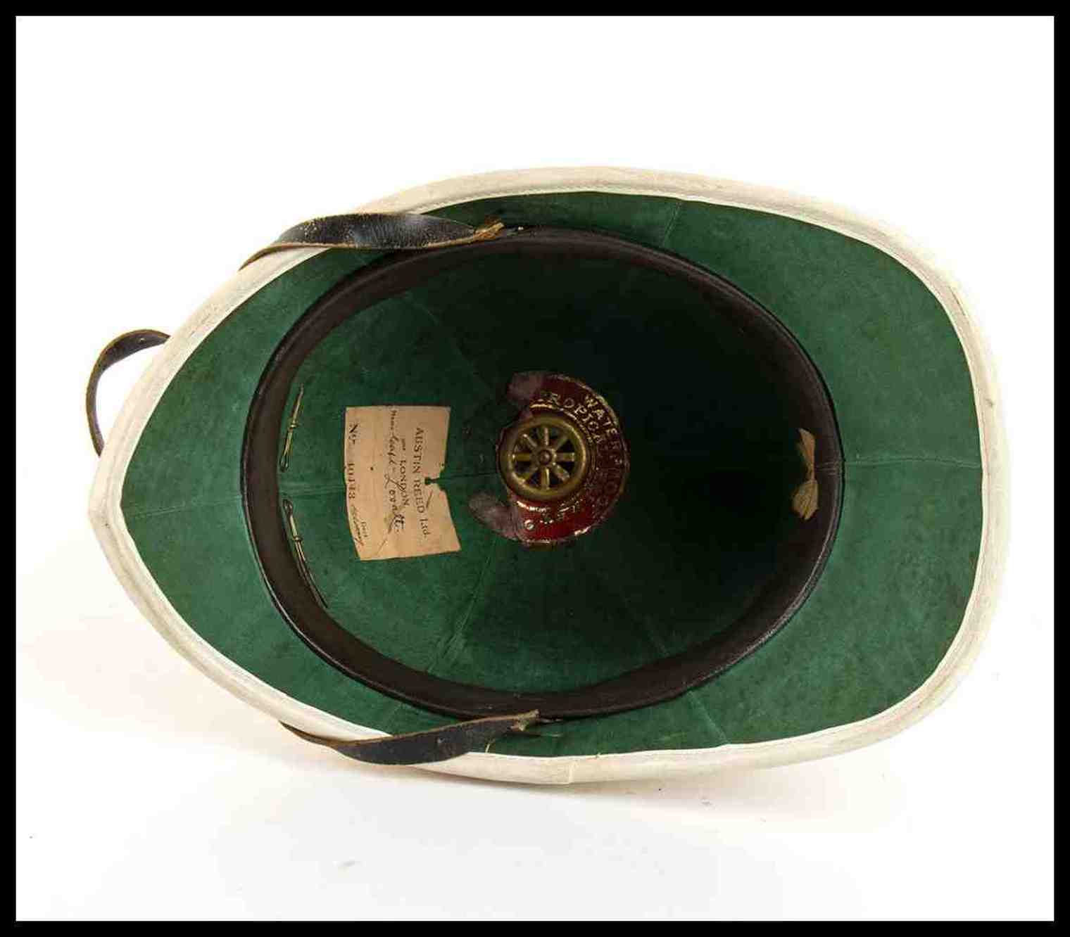bel casco di intendenza di tela bianca con fregio frontale in ottone e distintivo laterale, interno verde con marchi del fabbricante, ottimo stato