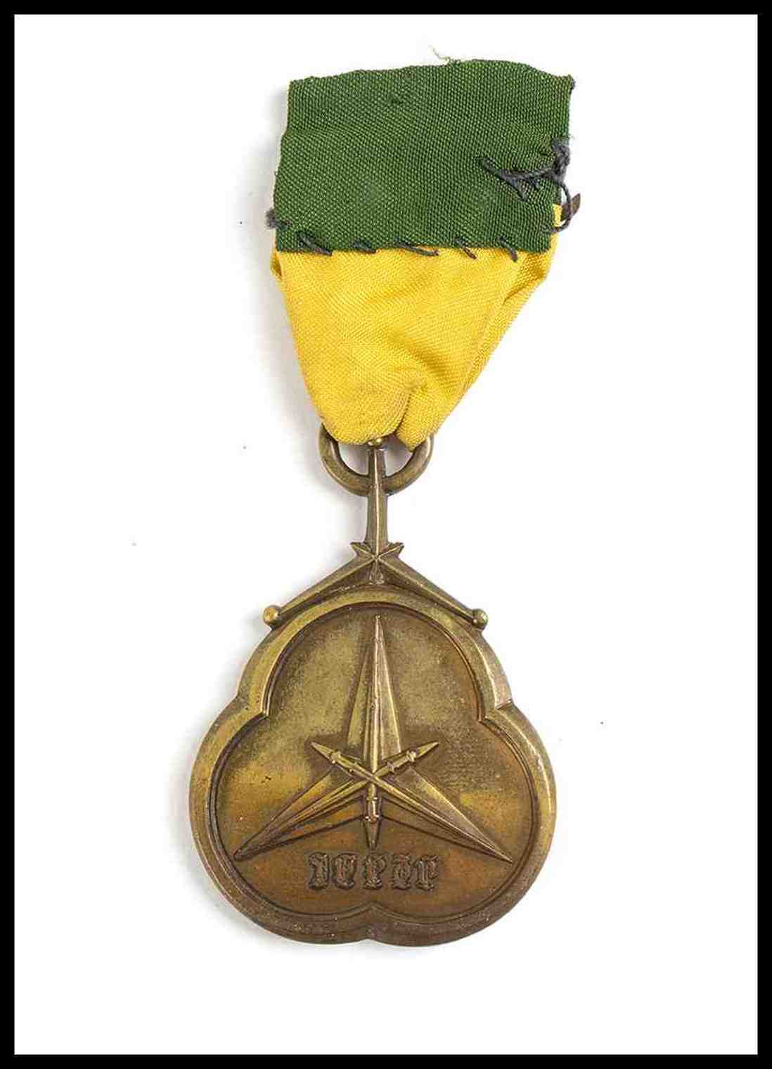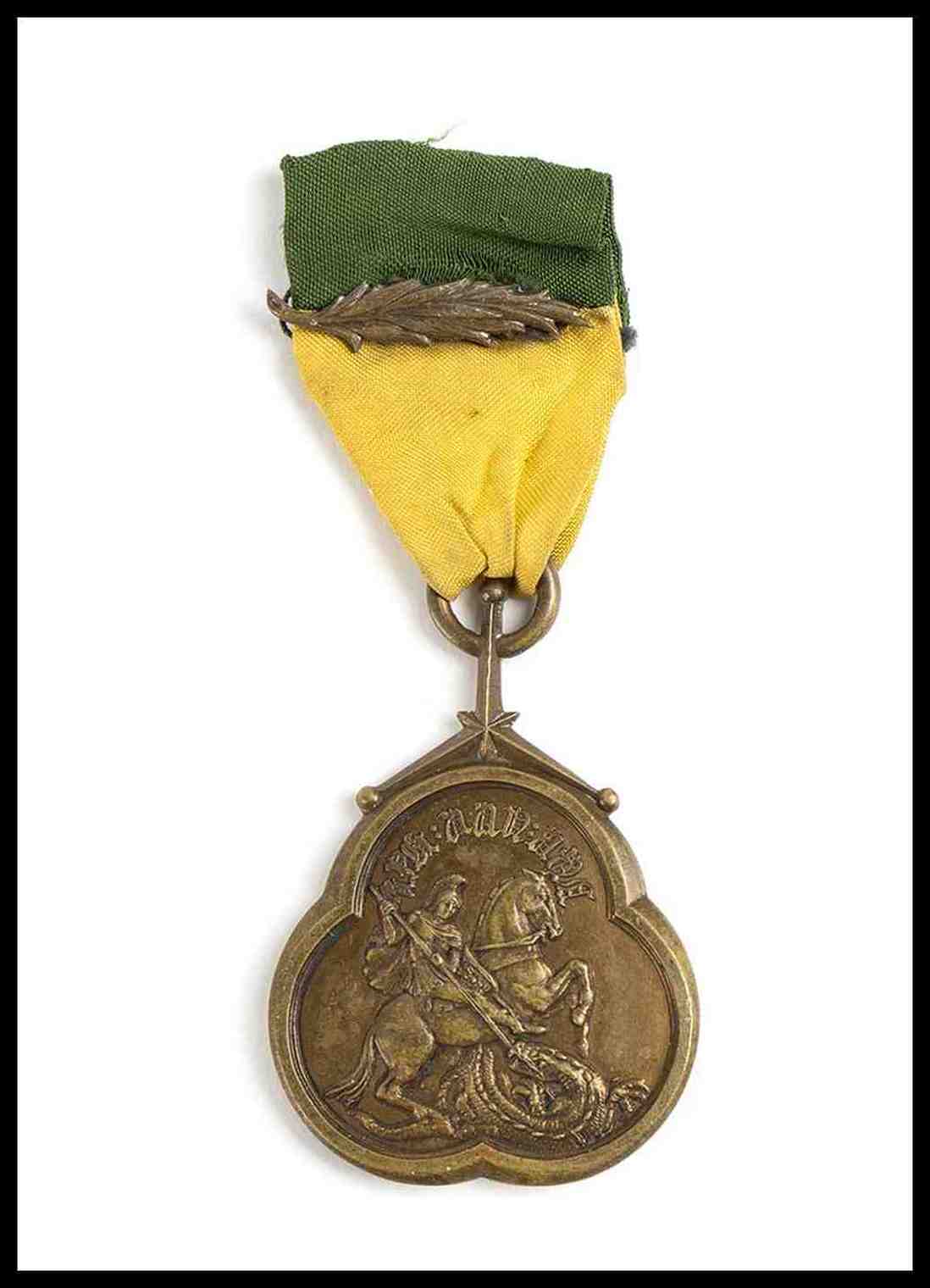 medaglia in forma di trifoglio con insegne di San Giorgio, conservata in sachetto con impresso Leone di Giuda, 40 mm diam.