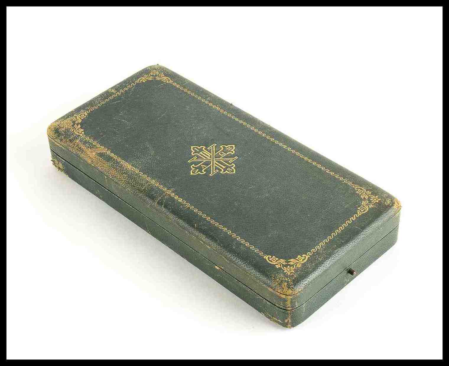 inizi XX secolo, antica e ottima manifattura Tanfani e Bertarelli, insegna da collo in argento e smalti ad una faccia con trofeo militare, placca in argento con applicazioni in smalto rosso, al verso placchetta a forma di losanga con i marchi del fabbricante, spillone centrale ed ardiglioni laterali, conservata in astuccio con impresso in oro le insegne dell’Ordine, ottimo stato.