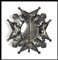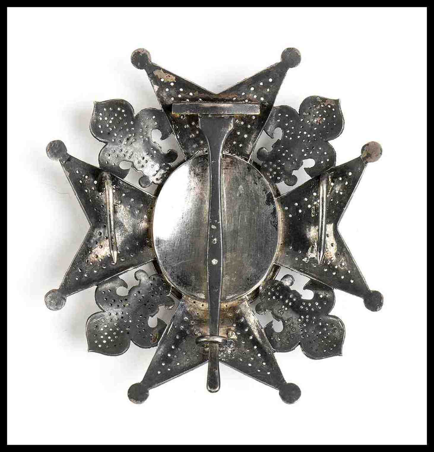 placca in argento gettato, inciso, traforato, parzialmente dorato, con applicazione centrale in oro e smalti, al verso spillone centrale e due ardiglioni, plachetta centrale incisa con dedica, 78 x 78 mm, fino XIX secolo