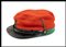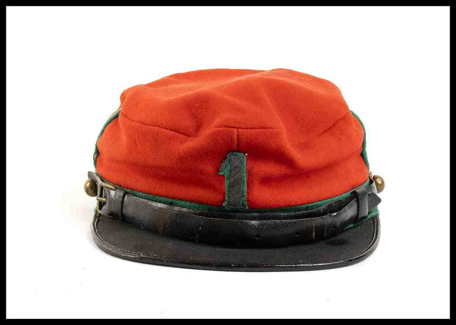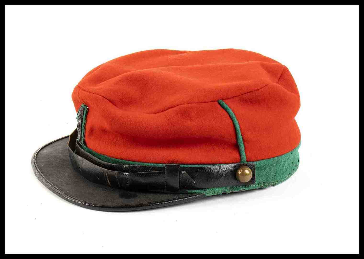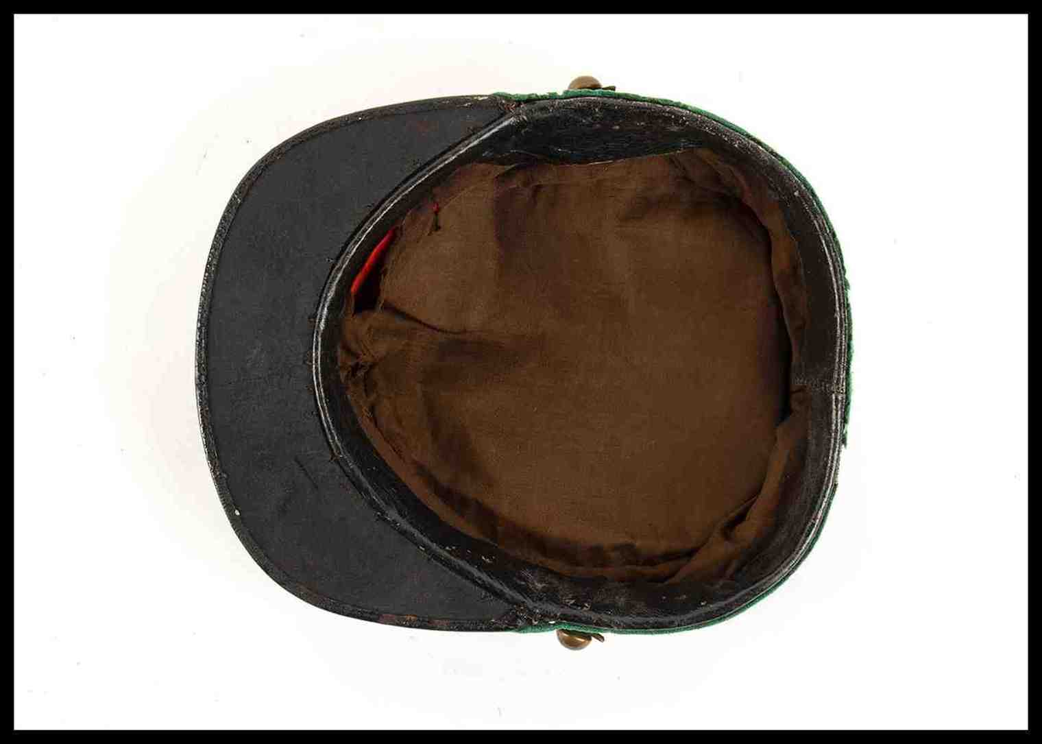 in panno rosso scarlatto, tamburo e montanti in panno verde, soggolo e visiera in cuoio, n. 1 ricamato in canottiglia argento su panno verde, interno in cottone con alluda in pelle nera, ottimo stato, molto bello