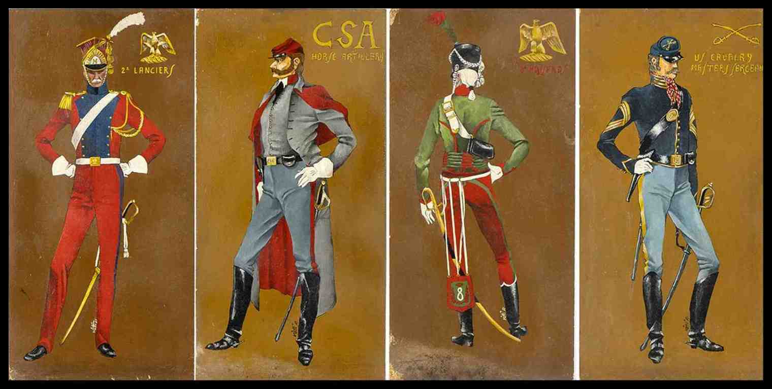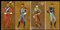 Lotto di cinque pannelli decorati con immagini di personaggi in divisa