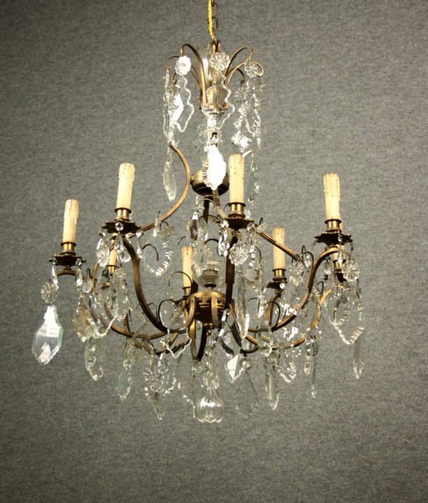 Firmato. Lampadario otto bracci con fusto in ottone e gocce di cristallo...