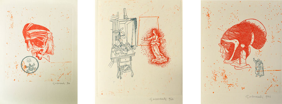GIUSEPPE GUERRESCHI L’eredità di Dante, 1966 Libro contenente 3 incisioni a colori tirate a 100 esemplari cadauna firmate e datate cm. 21x16 cadauna Giorgio Upiglio & C., Edizioni d’Arte Grafica Uno, Milano