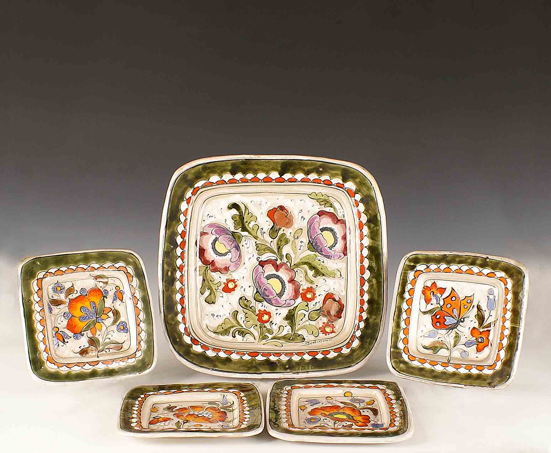 Serie di cinque piatti quadrati da parete in maiolica decorata a policromia a motivo floreale, firmati Schiavon, vecchia manifattura, misure diverse .