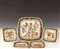 Serie di cinque piatti quadrati da parete in maiolica decorata a policromia a...