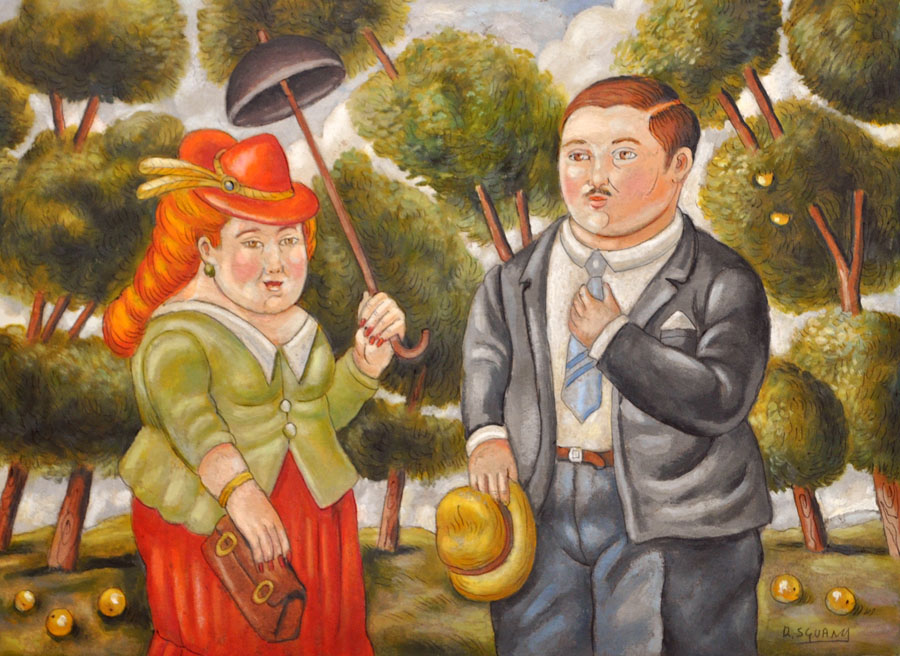 ROBERTO SGUANCI Coppia nel parco (Omaggio a F. Botero) Olio su cartone cm. 50x70 firmato Scorniciato