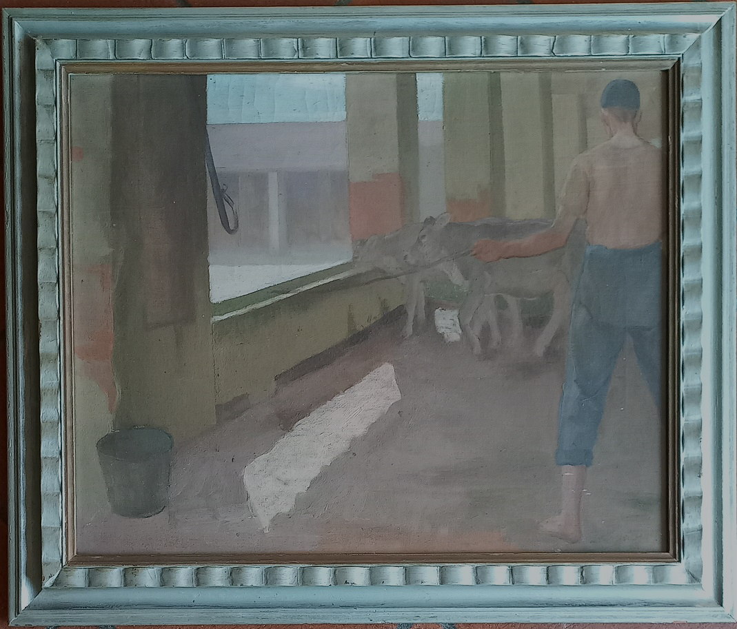 Firma indecifrata Nella stalla olio su tela cm.60x73 firmato in basso a destra