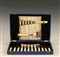 Servizio da pesce in metallo con manici in osso composto da sei forchette, sei coltelli e due posate da portata, entro astuccio, Inghilterra, vecchia manifattura.