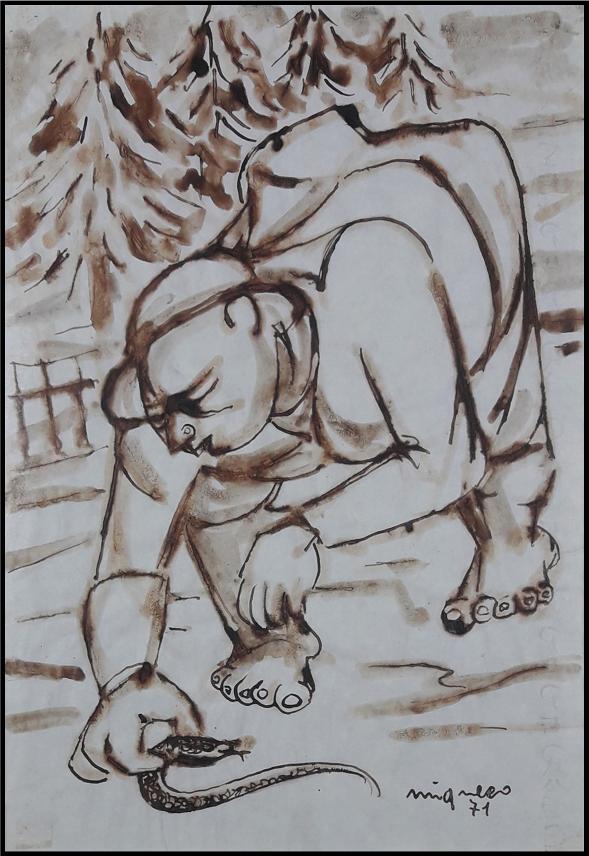 MIGNECO GIUSEPPE Messina 1903 - Milano 1997 "Il Serparo" Tecnica mista su carta applicata su tela cm 20x30 del 1971. Firmato e datato sul fronte in basso a destra. Sul retro timbro. Opera pubblicata sul catalogo generale. Archiviazione su foto.