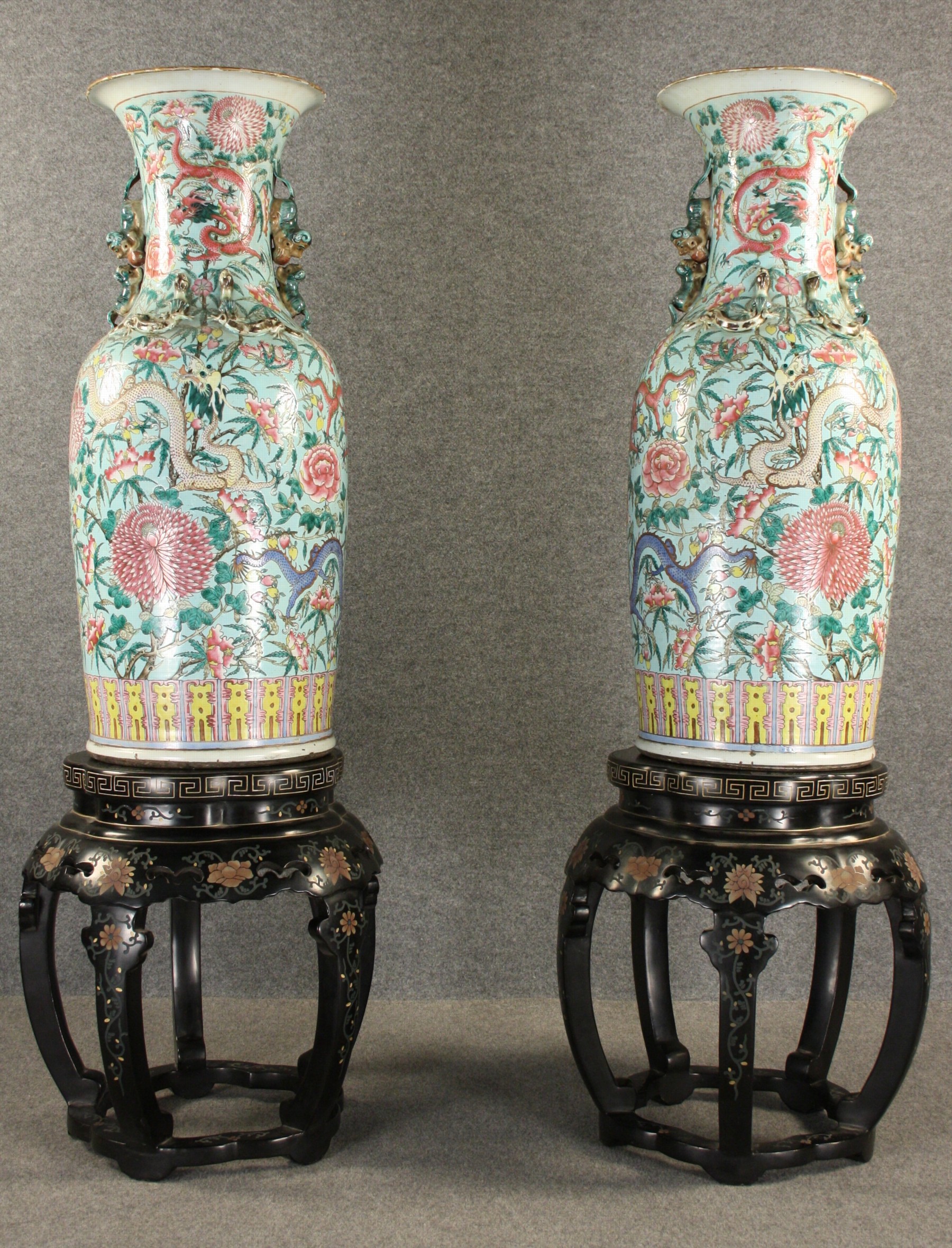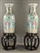 Firmato, datato. Coppia di vasi a tromba in porcellana famiglia verde con portavaso. Cina. XIX secolo. Mis. Alt. cm. 63 Diam. cm. 40 ca.