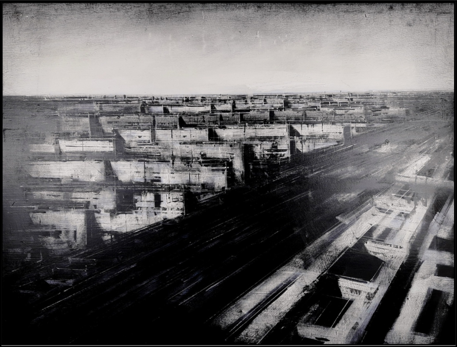 GUAITAMACCHI JONATHAN Londra 1961 "Ovest" Olio su carta cm 80x60 del 2004. Sul retro è firmato, intitolato e datato, etichetta di provenienza della Galleria Real Arte di Sant'Elpidio. Autentica su foto.