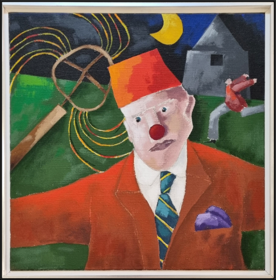 TADINI EMILIO Milano 1927 - 2002 "L'uomo dei fuochi d'artificio" Acrilici su tela cm 50,5x50,5 del 1987. Sul retro firmata ed intitolata. Autentica su foto a cura dello Studio Marconi.
