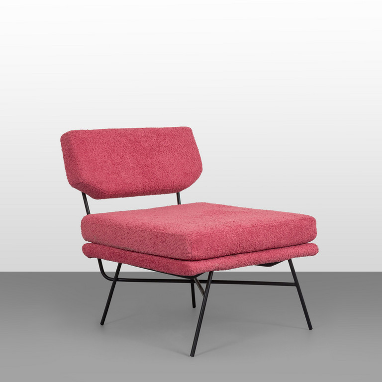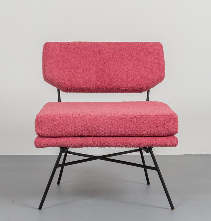 Acciaio verniciato sedile e schienale in gommapiuma rivestiti in tessuto. Etichetta della Manifattura.