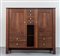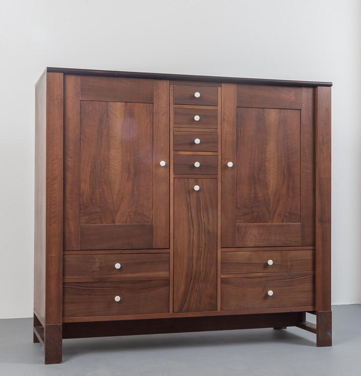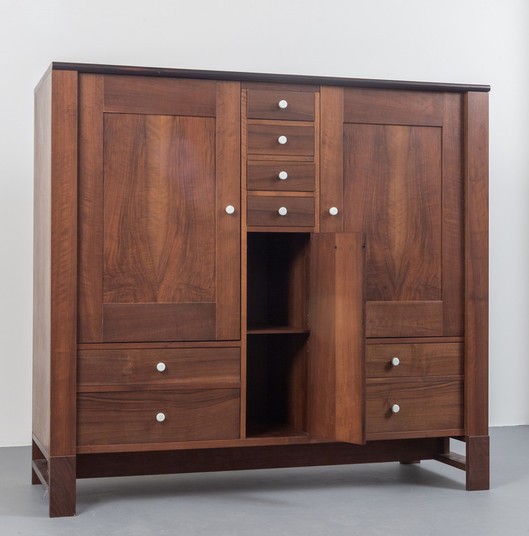 Walnut veneered wood with porcelain handles.
