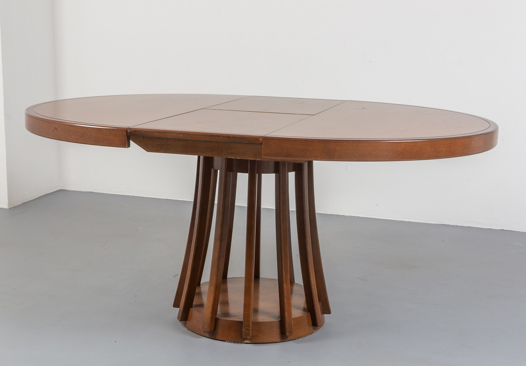 Basamento e cornice in legno di faggio tinto all'anilina piano impiallacciato noce.