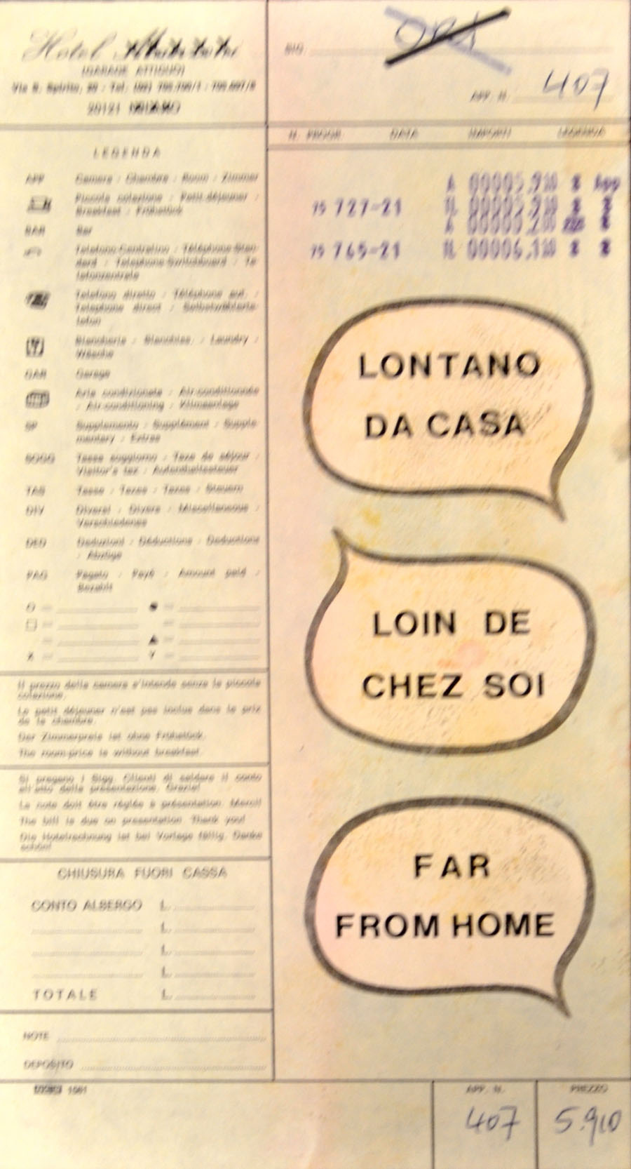 LUCIANO ORI Lontano da casa, 1975 Scrittura e collage su cartoncino cm. 28x14...