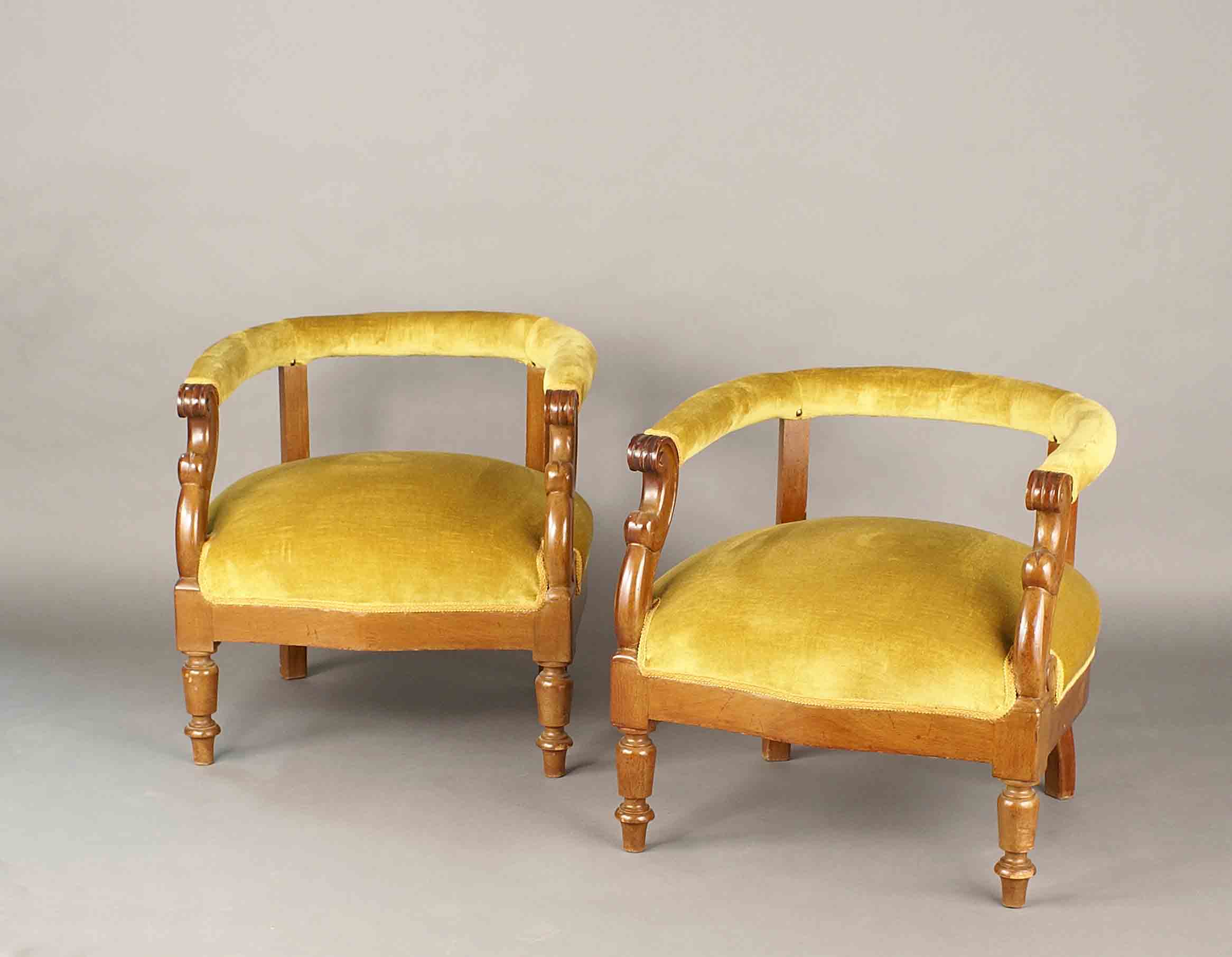 Coppia di poltroncine in legno di faggio tinto noce con schienali e sedute imbottite e rivestite in tessuto, vecchia manifattura, cm. 59x58x60.
