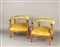 Coppia di poltroncine in legno di faggio tinto noce con schienali e sedute...