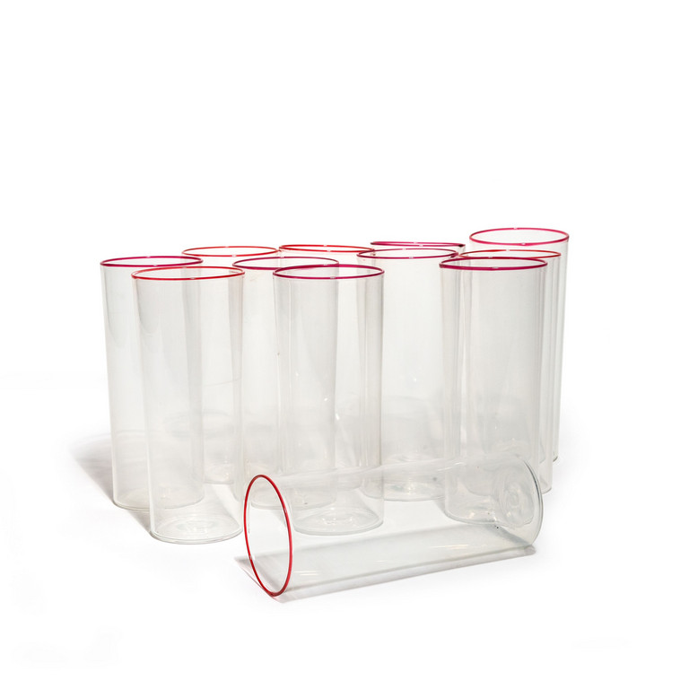 Dodici bicchieri in vetro trasparente con bordo rubino circa 1925