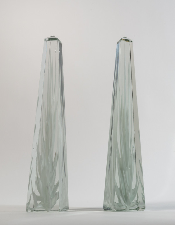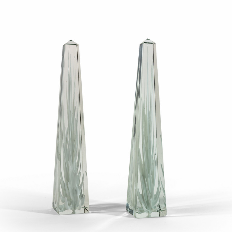 Una coppia di obelischi modello 2891 con decoro a fiamma in vetro lattimo.