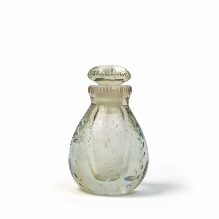Un flacone in cristallo e tracce di foglia oro con decoro di palmette incise e molature.