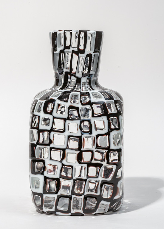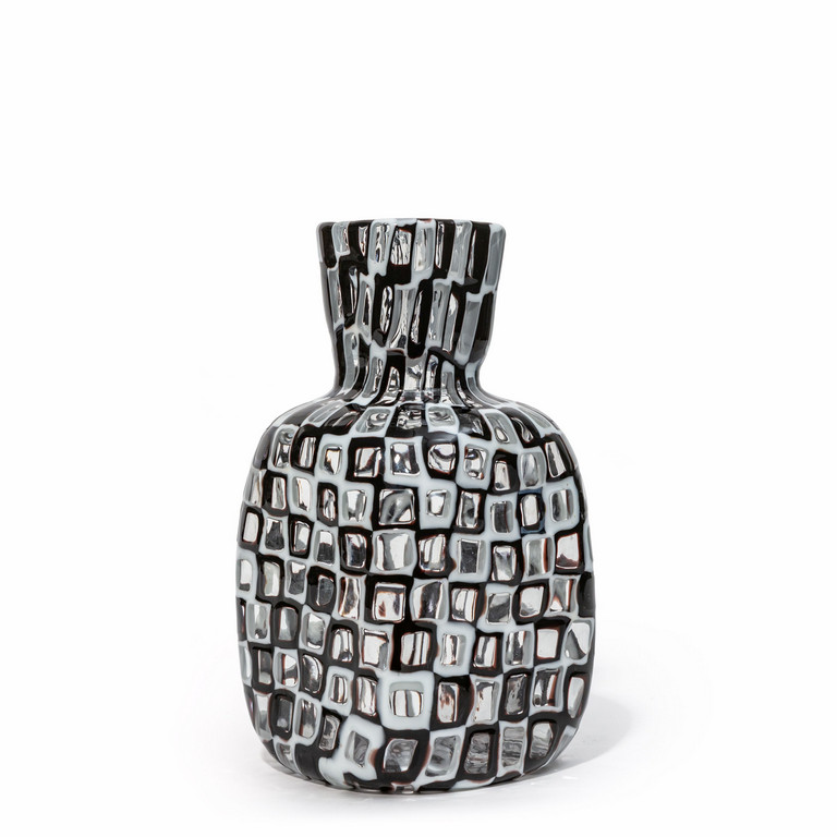 Un vaso 'occhi' in vetro a murrine lattimo e nero con nucleo cristallo.