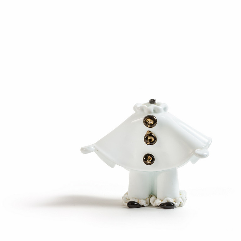 Una figura di pierrot portacandela in vetro lattimo e nero-oro.