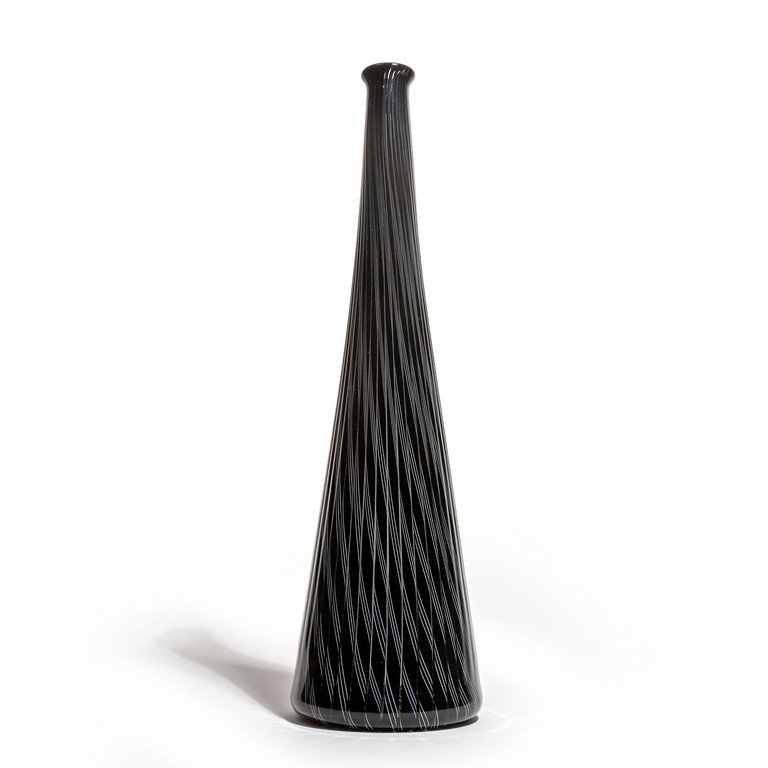 A bottle from the 'zanfirici' series with black glass canes and filigrana colored white lattimo.
