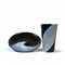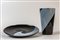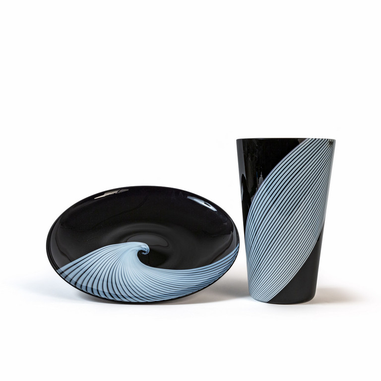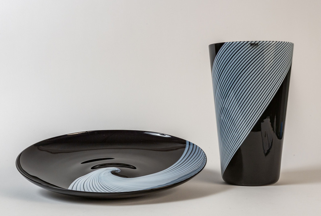 A vase and a plate in black glass with twisting white lattimo canes 1980's.