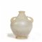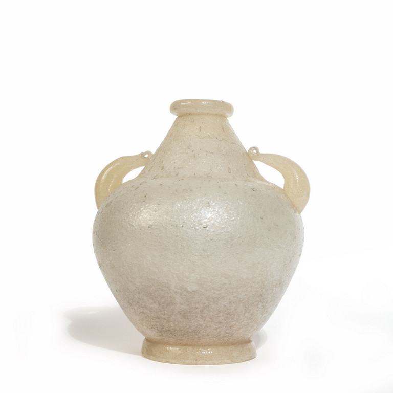 Un vaso in vetro pulegoso chiaro con due anse applicate.
