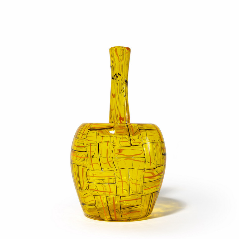 A bulb-shaped vase with interwoven amber tessere and a narrow cylindrical neck c. 1960.