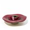 Una coppa in vetro rosso scuro incamiciato beige con tre grandi murrine di avventurina e centro nero.