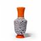 Un vaso con corpo a murrine spiralate con base e collo in vetro arancio.