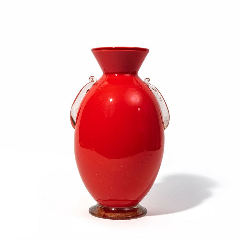 Un vaso color corallo con applicazioni in cristallo e foglia oro.