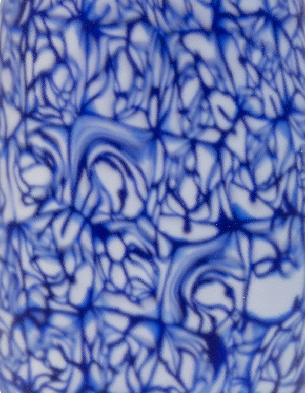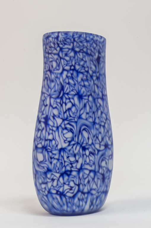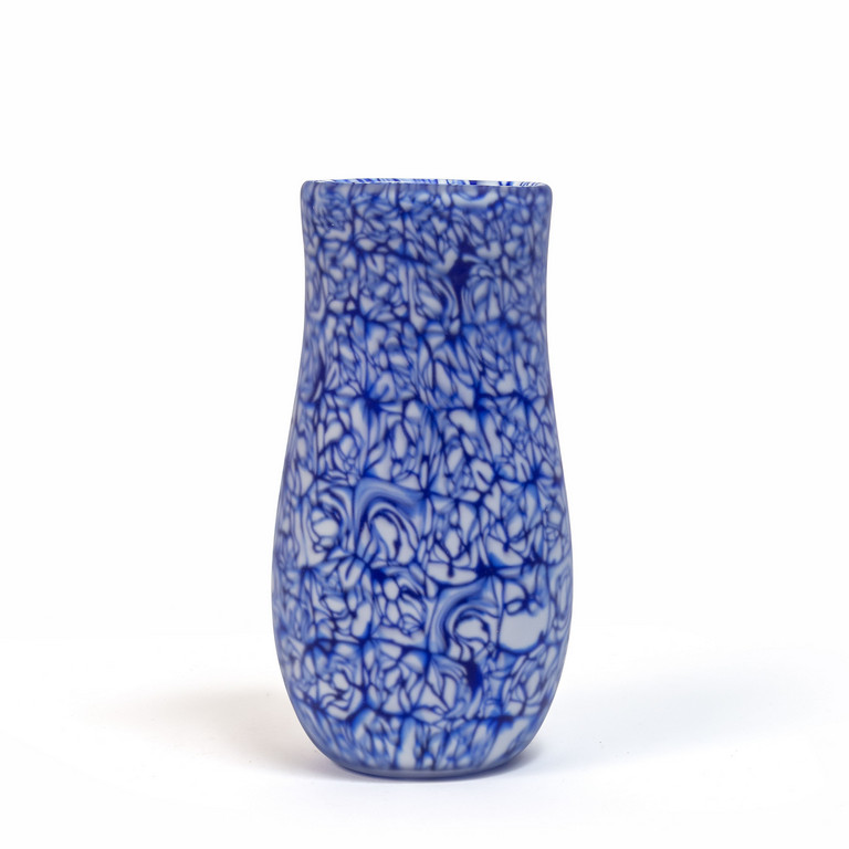 A vase made of white lattimo and blue rosette murrine dipped in an acid bath.