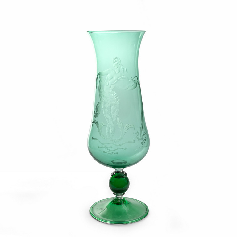 Un grande vaso in vetro trasparente verde con decoro di sirena incisa anni '50.
