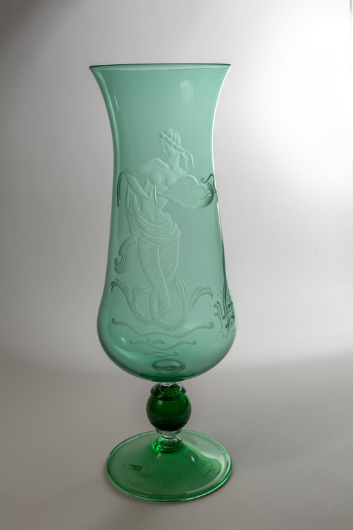 A large vase in transparent green glass with an etched mermaid 1950's.