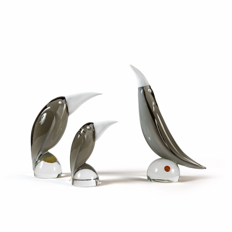 Tre figure di tucano in vetro sommerso fumé e lattimo.